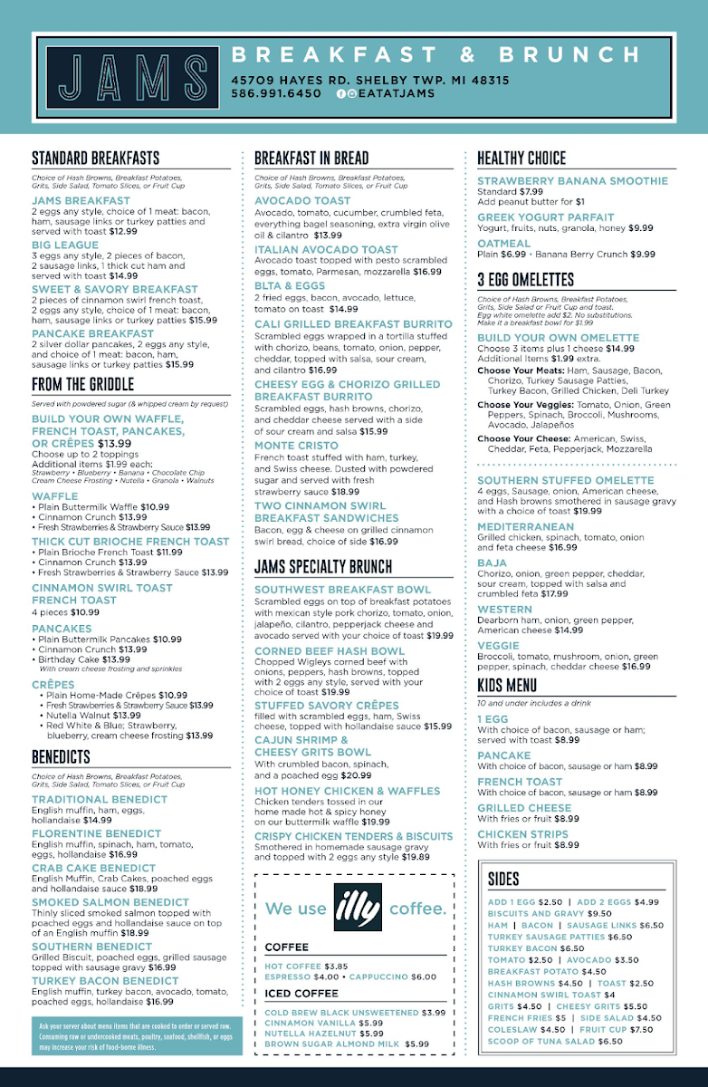 Welcome to Jams Brunch House & Bar, your new go-to destination for a delightful brunch experience in Shelby Township, MI! Nestled at 45709 Hayes Rd, this vibrant brunch spot has quickly become a favorite for locals and visitors alike, boasting a warm ambiance and a diverse menu that caters to every palate.
